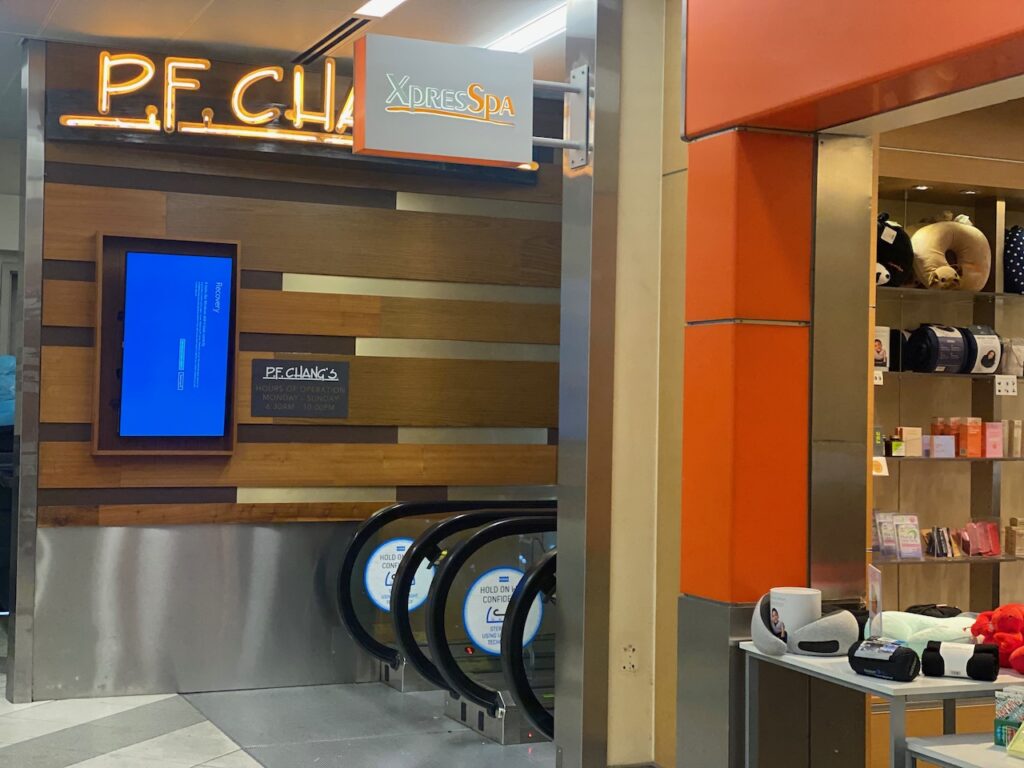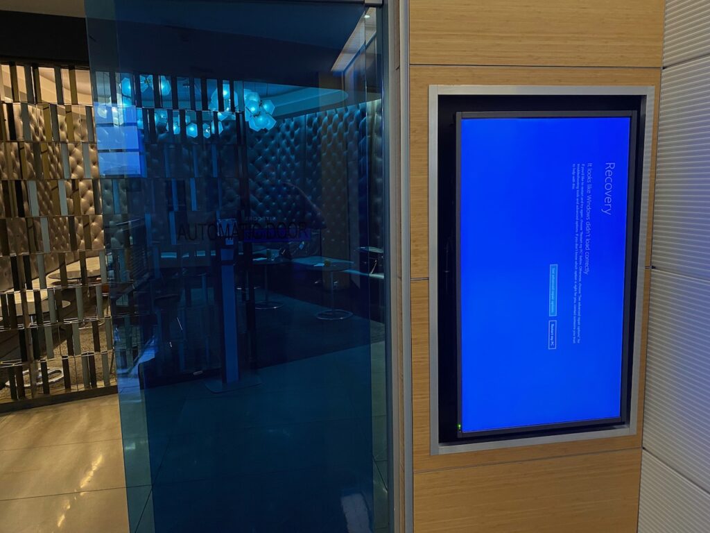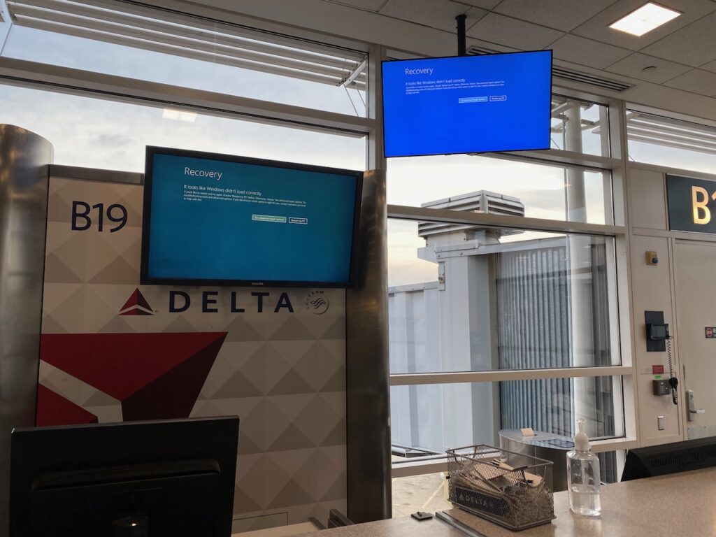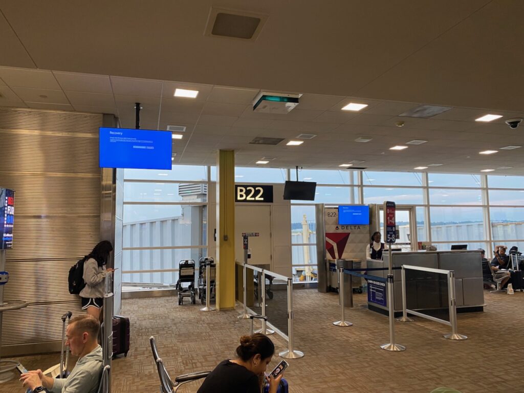 Overnight they cancelled another one of my flights. This was starting to feel like Tom Hanks in The Terminal. Back to the airport. I was getting frustrated. There were sad faces on blue screens of death. All the digital signage was broken above all the gates and the same bright blue screen glowed at the Delta Sky Lounge where they were struggling to check-in guests.