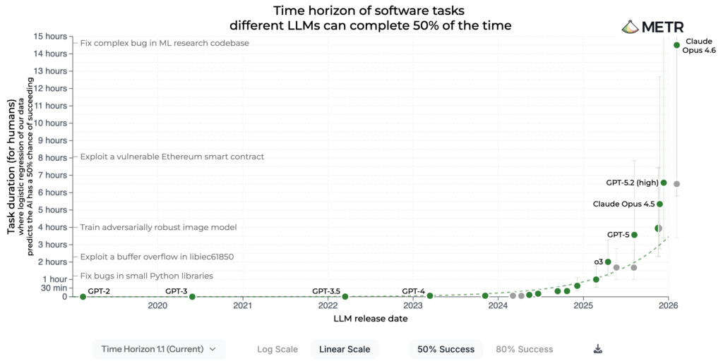 In an essay in February 2026 Matt Schumer wrote, “if you extend the [METR] trend (and it’s held for years with no sign of flattening) we’re looking at AI that can work independently for days within the next year. Weeks within two. Month-long projects within three.”